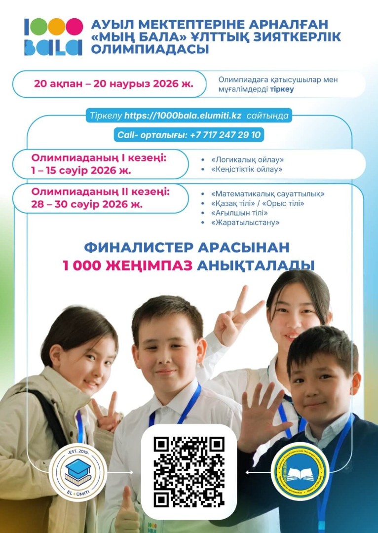 Қазақстан Республикасы Оқу-ағарту министірлігінің орта білім беру комитеті «El Umiti» Корпоративтік қорының ұйымдастыруымен өтетін ауыл мектептерінің 6 сынып оқушыларына арналған «Мың бала» Ұлттық зияткерлік олимпиадасының өтетін хабарлаймыз.